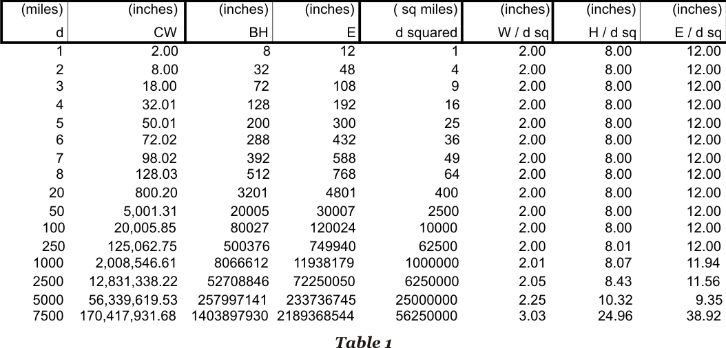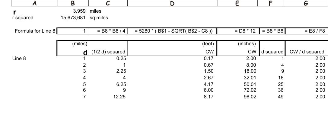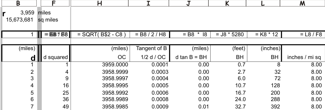Placing the formulas in a spreadsheet as shown and replicating down, we make a table for distance vs height. As you can see the height of the water bulge is about 2 inches times the square of the number miles of distance.