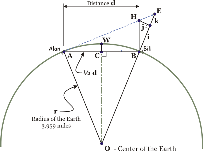 Draw line AB from Alan to Bill, and mark its center point C. The water bulge between Alan and Bill, line CW, is r minus the length of line OC.