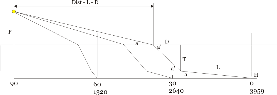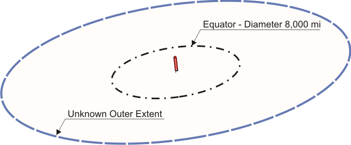 So here's our working model. Such dimensions as exist are simply chosen. The known axioms do not define the gap. We cannot prove its distance constant or that it is parallel to the earth plane. These cautions are given because a casually drawn diagram may imply relationships not in evidence, leading inadvertently to an unfounded assumptive basis.